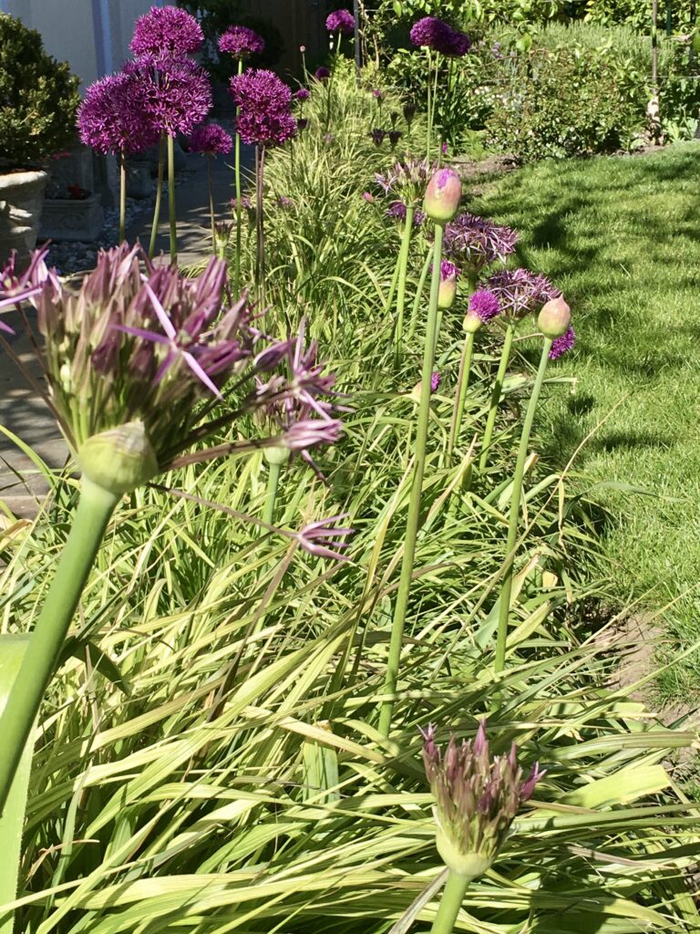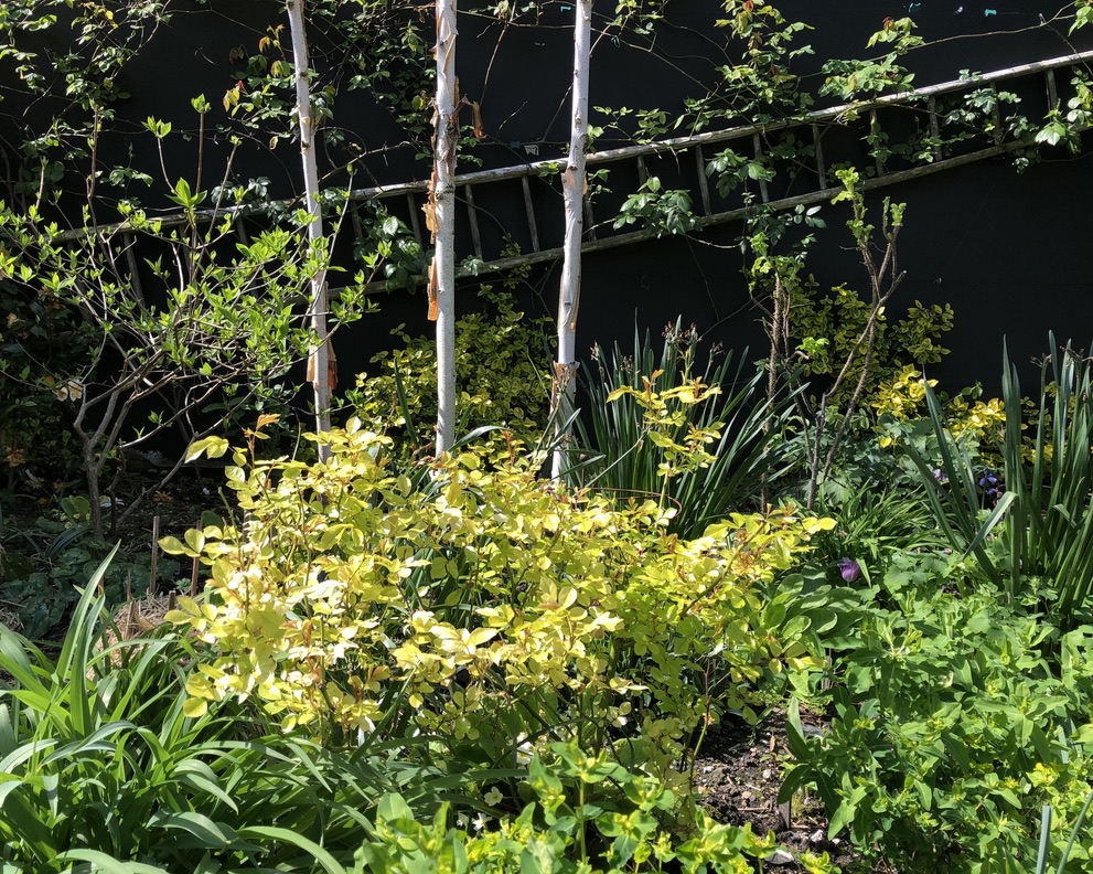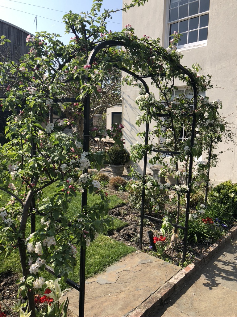 I live in Lewes, in East Sussex where the chalky, stony, nutrient-poor free-draining soil is markedly different from the clay at our previous home, baked hard in summer and a quagmire in winter. Our Georgian town house has a south-facing garden that I re-designed which wraps around two sides. Part-walled and part-hedged, it has a shaded white garden, trained fruit, a mature free-standing fig tree which acts as our sun-shade in summer, a herb garden with seating alcove surrounded by fan-trained plums, and a crab apple arch through which is viewed the 18C water tank and spout at the far end of the lawn. Climbing roses, above a row of Pennisetum alopecuroides ‘Red Buttons’, purple Alliums towering above them in May, line the path to a second small lawn. Seasonal white climbing roses climb a rendered wall painted black to contrast the white-stemmed birches central to the bed. Next to a terrace cordoned pears and apples screen a utility area and shed.